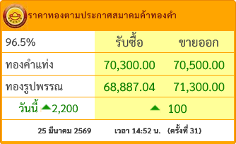 ราคาทองคำประจำวันที่ 25 มี.ค.2569 พุ่งแรง 2,000 บาท โดยทองรูปพรรณขายออกที่บาทละ 71,300.00 บาท อ้างอิงข้อมูลล่าสุดจาก สมาคมค้าทองคำ ที่เผยแพร่ผ่านทางเว็บไซต์ เมื่อเวลา 14:52 น. (ครั้งที่ 31)