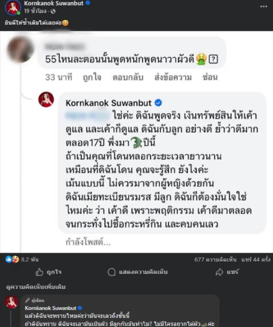 นอกจากนี้ แม่ตั๊กยังได้โพสต์คอมเมนต์ของผู้ใช้โซเชียลรายหนึ่งที่ตั้งคำถามว่า ไหนตอนนั้นพูดนักว่าสามีดี ก่อนจะตอบกลับว่า ใช่ค่ะ ดิฉันพูดจริง เงินทรัพย์สินให้เค้า ดูแล และเค้าก็ดูแล ดิฉันกับลูกอย่างดี ย้ำว่าดีมากตลอด17ปี พึ่งมาไม่ดีปีนี้